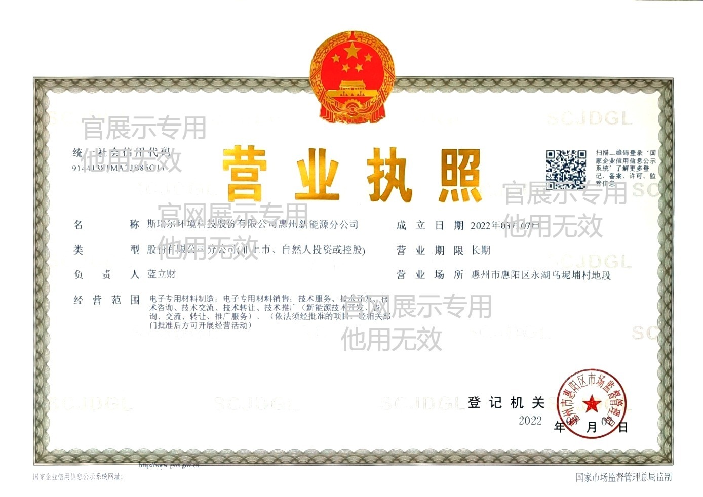 斯瑞尔惠阳鸿海分公司营业执照