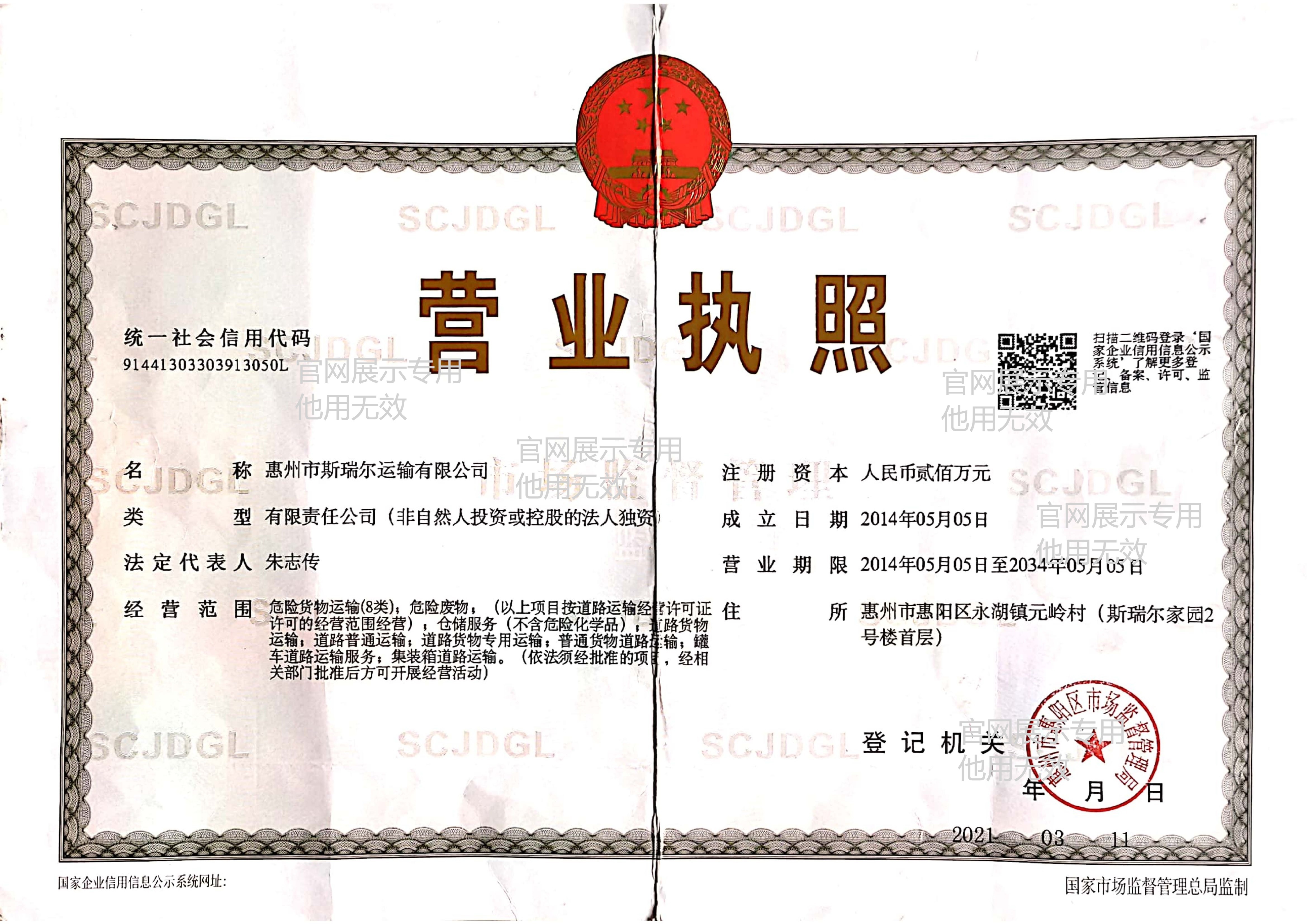 惠州斯瑞尔运输公司营业执照